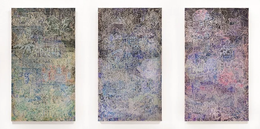 An imposing triptych — greenish on the left, then bluish, then purple — hangs on one wall of Siennie Lee’s studio at the Fine Arts Work Center in Provincetown. Its abstraction barely fades as you draw nearer, even as the geometry of its painstaking detail emerges: hidden behind the rectangles and ovals are veiled bodies, interlocked on each panel.